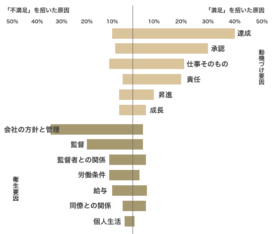 アメリカの臨床心理学者フレデリック・ハーズバーグが提唱した仕事における満足と不満足を引き起こす要因に関する理論によると、人間が仕事に満足感を感じる要因と不満足を感じる要因は全く別物と述べています。