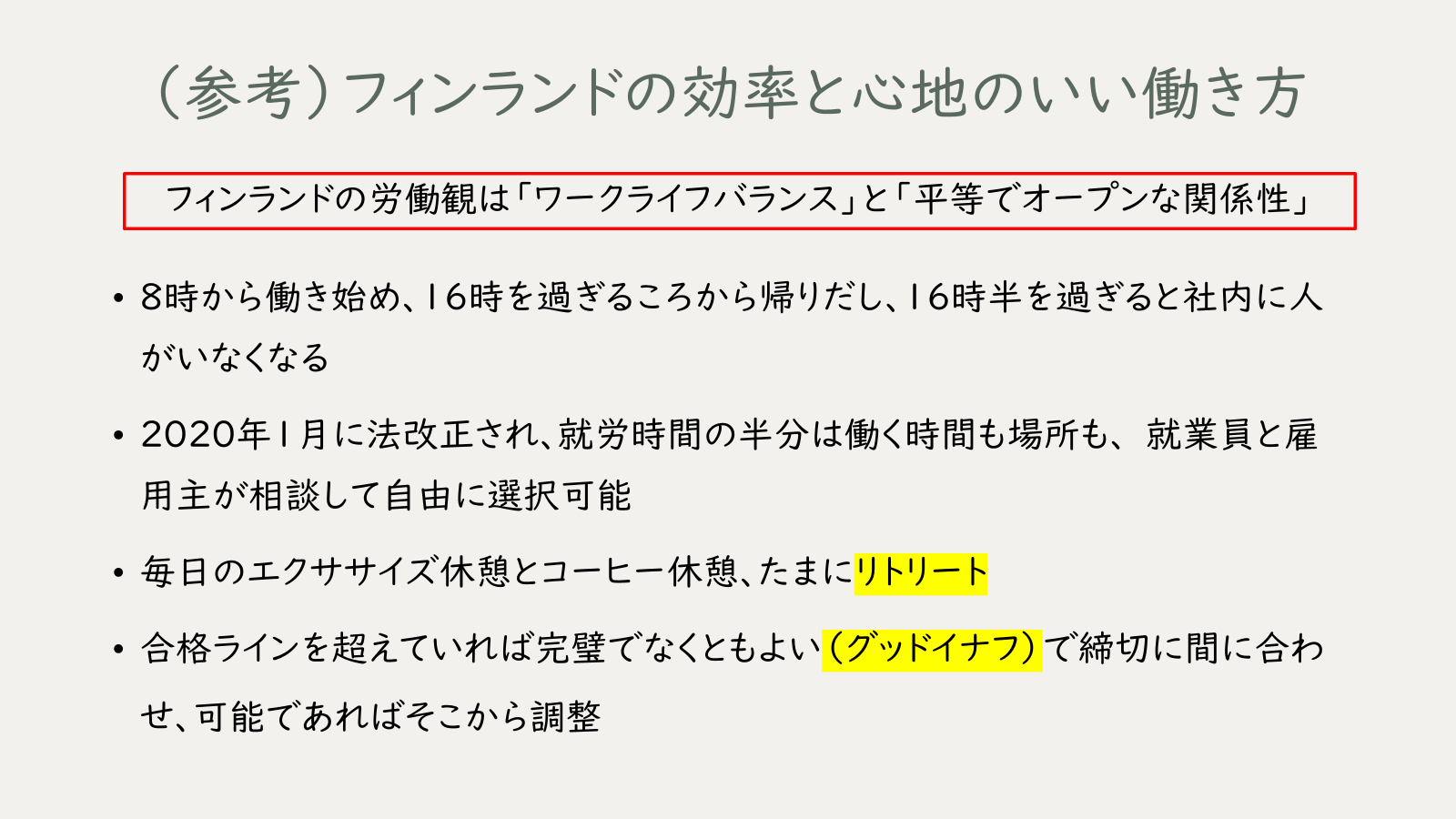 スローワーキングの2つめの原則「余裕」はフィンランドの働き方を参考にするといいでしょう。ものづくりでは完璧でなければいけませんが、知的労働であればグッドイナフで充分なことの方が多いのではないでしょうか。
