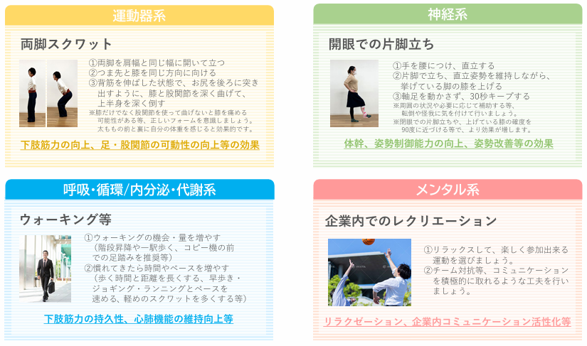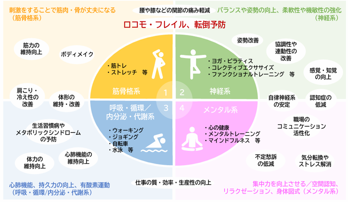 運動・スポーツは①筋骨格系、②神経系、③呼吸・循環/内分泌・代謝系、④メンタル系 の4つに分類でき、自分の身体の調子・状態に応じた運動・スポーツを選んで行うことをスポーツ庁が推奨しています。