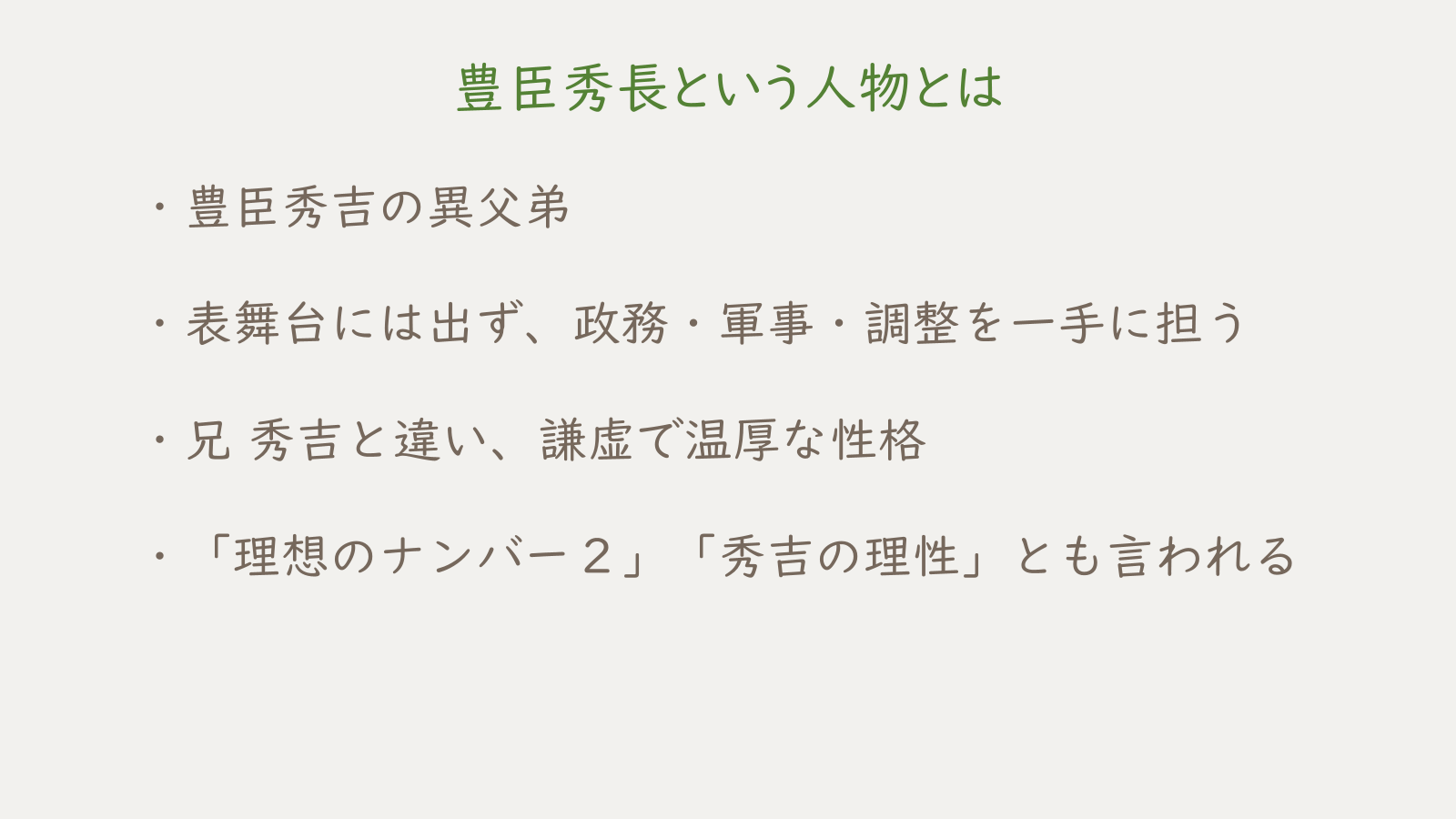 尾張国(現在の愛知県)で生まれ、百姓仕事に励んで母や妹と質素な生活を営んでいた中、家を出て信長に仕えるようになった兄の秀吉から「俺の家来になってくれ」と頼まれ武士の道に進むことになりました。秀長は兄の脚を引っ張らないよう、周りとの信頼を得るよう心掛けてきたようです。